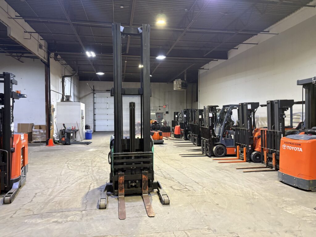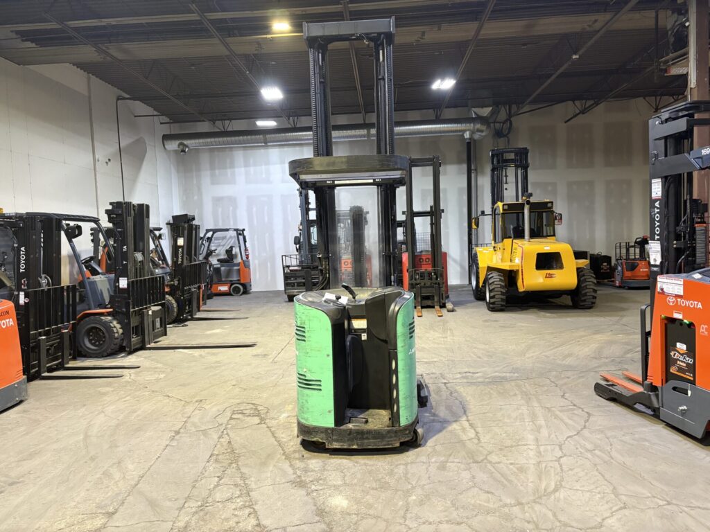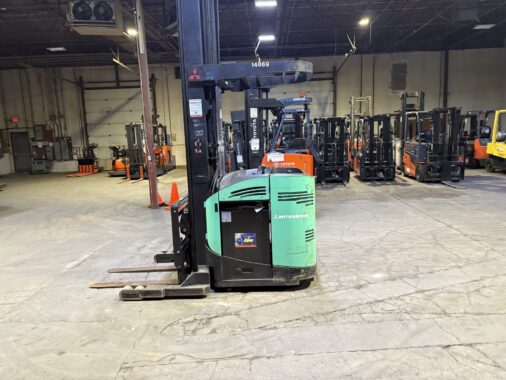 Mitsubishi ESR23N electric reach truck with 5,000 lb capacity — smooth, precise, and built for narrow-aisle warehousing. Ideal for high stacking and efficient pallet handling in tight spaces.